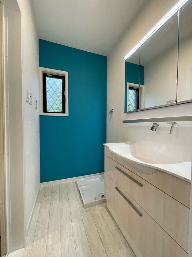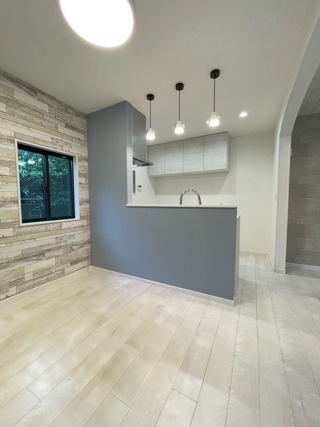 ブルーや木目調のクロスが印象的な多世代リノベ